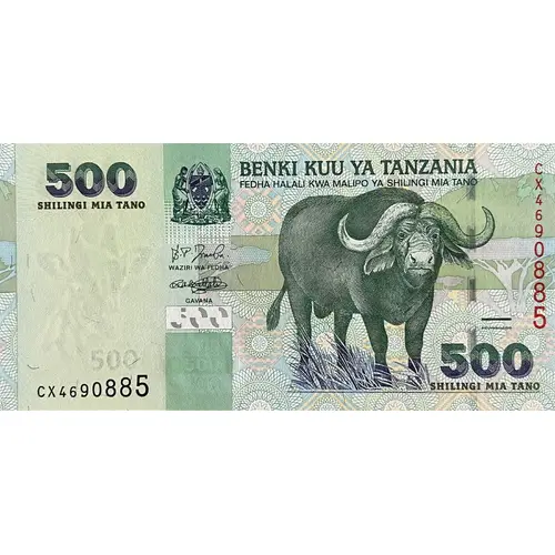 Reverse lettering BANK OF TANZANIA 500 FIVE HUNDRED SHILLINGS