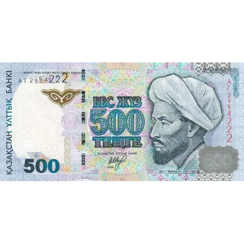 Légende de l’avers БАНКНОТТАРДЫ ҚОЛДАН ЖАСАУ ЗАҢМЕН ҚУДАЛАНАДЫ ҚАЗАҚСТАН ҰЛТТЫҚ БАНКІ БЕС ЖҮЗ 500 ТЕҢГЕ ҚАЗАҚСТАН ҰЛТТЫҚ БАНКІ 1999 ӘЛ - ФАРАБИ - 870 – 950ж