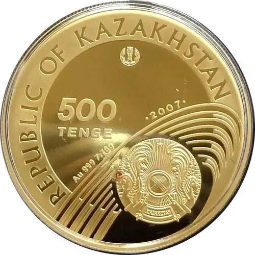 On the front side of the coin in the lower part there is a coat of arms of the Republic of Kazakhstan framed by a stylized image of the stadium, the inscription `Au 999 7,78g` denoting the metal from which the coin was made, its sample and mass, and the number `2009` denoting the year of coinage. In the upper part there is the inscription `500 TENGE` denoting the denomination of the coin and the logo of the National Bank of the Republic of Kazakhstan. On the perimeter of the coin there is a wide, frosted edging, on which is located the circumferential inscription `REPUBLIC OF KAZAKHSTAN` in English. |