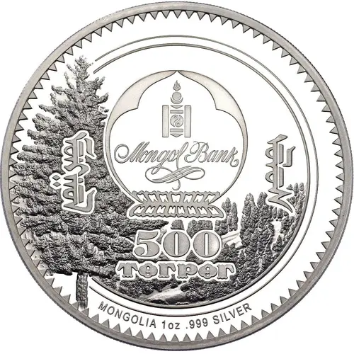 Mongol Bank ᠮᠤᠩᠭᠤᠯ ᠤᠯᠤᠰ 500 TӨГРӨГ MONGOLIA 1oz .999 SILVER (Translation: Bank of Mongolia Monggol Ulus (Mongolia) 500 Tögrög MONGOLIA 1oz .999 SILVER) |