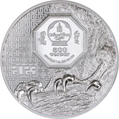 The obverse shows the sharp talons of a Falcon in Ultra-High relief. The background has a unique geometric pattern with the hidden `2023` - the date of issue struck into the design. The obverse also includes the Coat of Arms of Mongolia and the inscriptions: `2000 тогрог` – the face value, `MONGOLIA` – the country of issue and `1 oz .9999 SILVER` – the fineness and the weight of the Silver. |