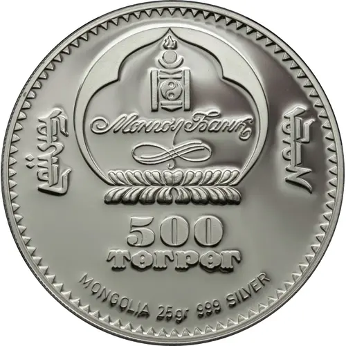 | Obverse lettering | Монгол Банк ᠮᠤᠩᠭᠤᠯ ᠤᠯᠤᠰ 500 ТӨГРӨГ MONGOLIA 25 gr 925 SILVER (Translation: The Bank of Mongolia Monggol Ulus (Mongolia) 500 Tögrög) |