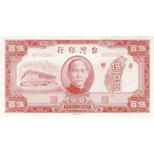 行銀灣台 幣台 伍 百 圓 印年五十三國民華中 廠製印央中 (Translation: Bank of Taiwan Taiwanese currency Five Hundred Yuan Printed in the 35th year of the Republic of China Central Printing and Engraving) |