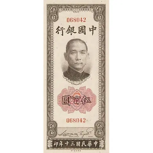 | Obverse lettering | 行銀國中 圓百伍 (Translation: Bank of China Five Hundred Yuan) |