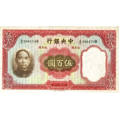 | Obverse lettering | 行銀央中 圓百伍 印年五十二國民華中 (Translation: Central Bank of China Five Hundred Yuan Printed in the 25th year of the Republic of China) |