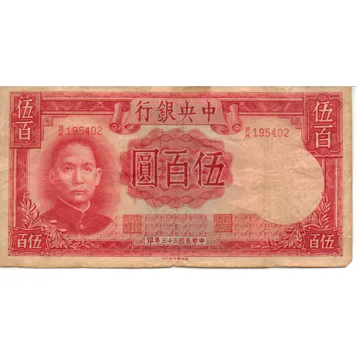 | Obverse lettering | 行銀央中 圓佰五 印年三十三國民華中 (Translation: Central Bank of China Five Hundred Yuan Printed in the 33rd year of the Republic) |