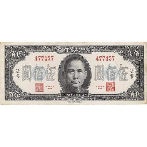 | Obverse lettering | 行銀央中 法 幣 圓佰伍 印年四十三國民華中 司公票鈔安保商美 (Translation: The Central Bank of China Fiat money Five Hundred Yuan Printed in the 34th year of the Republic of China American Security Banknote Company) |