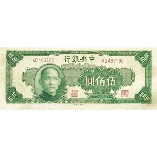 | Obverse lettering | 行銀央中 圓佰伍 印年四十三國民華中 (Translation: Central Bank of China Five Hundred Yuan Printed in the 34th year of the Republic of China) |