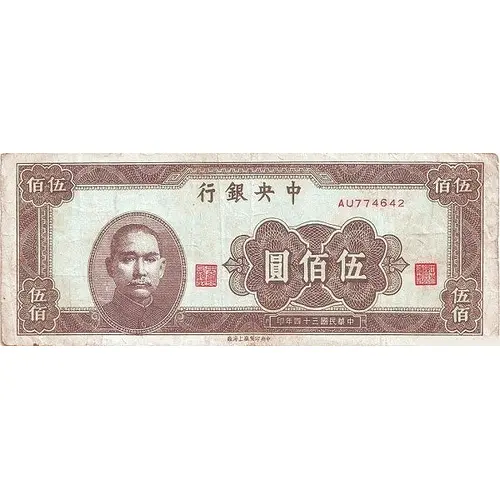 | Obverse lettering | 行銀央中 圓佰伍 印年四十三國民華中 (Translation: Central Bank of China Five Hundred Yuan Printed in the 34th year of the Republic of China) |