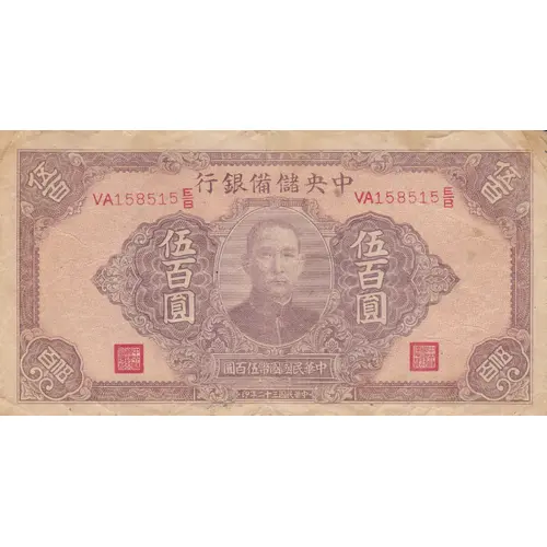 | Obverse lettering | 中央儲備銀行 伍百圓 中華民國國幣伍百圓 中華民國三十二年印 (Translation: Central Reserve Bank of China 500 Yuan 500 Yuan national currency of the Republic of China Printed in the 32nd year of the Republic of China) |