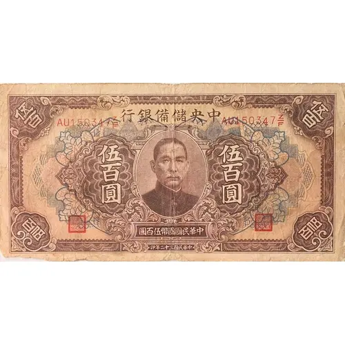| Obverse lettering | 中央儲備銀行 伍百圓 中華民國國幣伍百圓 中華民國三十二年印 (Translation: Central Reserve Bank of China 500 Yuan 500 Yuan national currency of the Republic of China Printed in the 32nd year of the Republic of China) |