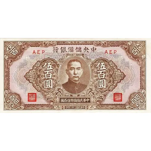 | Reverse lettering | THE CENTRAL RESERVE BANK OF CHINA 500 GOVERNOR VICE GOVERNOR FIVE HUNDRED YUAN 1943 |