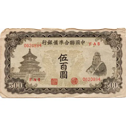 | Obverse description | Black on olive green underprint. Red block letters, serial numbers and seals. Temple of Heaven left, Confucius right. |