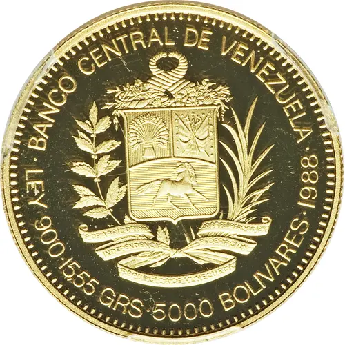 •BANCO CENTRAL DE VENEZUELA• LEY 900•15,55 GRS•5000 BOLIVARES•1988 (Translation: Venezuela Central Bank 0.900 15.55 grams 5000 Bolivares 1988) |