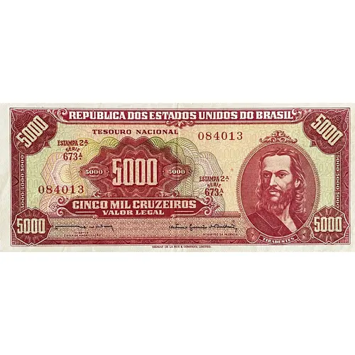 | Obverse description | Solferino red on polychrome chalcography and offset. On the right, oval medallion with the figure of Joaquim José da Silva Xavier, Tiradentes (1746-1792). Above couplet `REPÚBLICA DOS ESTADOS UNIDOS DO BRASIL` (Republic of the United States of Brazil). Below the inscription `CINCO MIL CRUZEIROS / VALOR LEGAL` (Five Thousand Cruzeiros / Legal Amount). On the left, print number, serial number (above), the sequence number (center) and signature of Director of the Amortization Fund. On the right, the sequence number (above), print number, serial number (center) and signature of Finance Minister (below). |