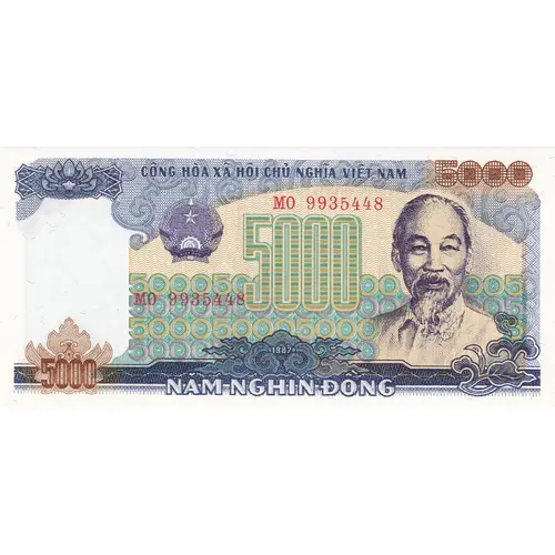 Blue on multicolor underprint. Red serial numbers. Ho Chi Minh at right, arms at left center. |