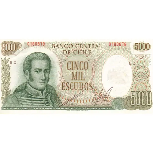 BANCO CENTRAL DE CHILE CINCO MIL ESCUDOS `HA LLEGADO LA HORA DE LA INDEPENDENCIA AMERICANA, NADIE PUEDE EVITARLA.` - CARRERA CASA DE MONEDA DE CHILE (Translation: Central Bank of Chile Five Thousand Escudos `The time for American Independence has come, no can avoid it.` Chile Mint) |
