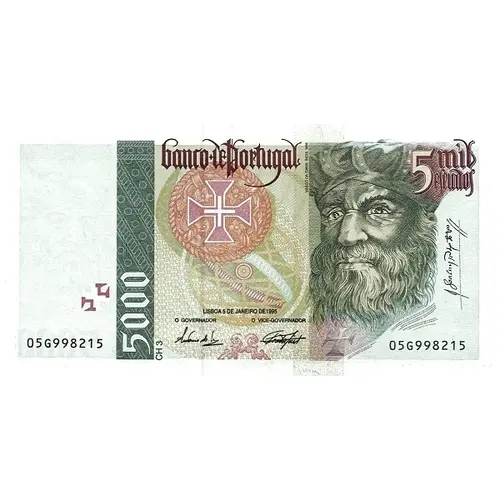 | Arka yüz lejandı | 5000 banco de Portugal 5000 Tal embaixada dava o Capitão A qual o Rei gentio respondia Que em ver embaixadores de Nação Tão remota grão glória recebia. Camões - Os Lusíadas (Translation: 5000 Bank of Portugal Such an embassy was given by the Captain To which the Gentile King responded That in seeing ambassadors of the Nation So remote a grain of glory received. Camões - Os Lusíadas) |