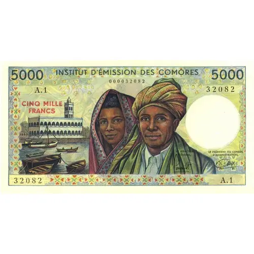 Obverse lettering INSTITUT D`ÉMISSION DES COMORES CINQ MILE FRANCS