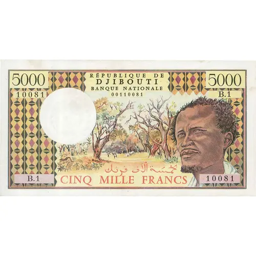 | Obverse lettering | 5000 RÉPUBLIQUE DE DJIBOUTI BANQUE NATIONALE خمسة آلاف فرنك CINQ MILLE FRANCS (Translation: Republic of Djibouti. National Bank. Five thousand francs.) |