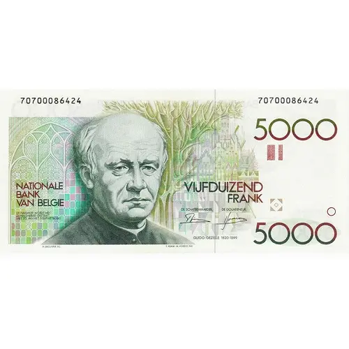 | Ön yüz lejandı | 5000 NATIONALE BANK VAN BELGIE DIE NAMAKER WORDT MET DWANGARBEID GESTRAFT (ART. 173 VAN HET STRAFWETBOEKI) VIJFDUIZEND FRANK GUIDO GEZELLE 1830-1899 5000 H. DECUYPER SC. Y. ADAM - M. HÜRRIG INV (Translation: National Bank of Belgium The counterfeiter will be punished with forced labor (art. 173 of the criminal code). Five Thousand Francs) |