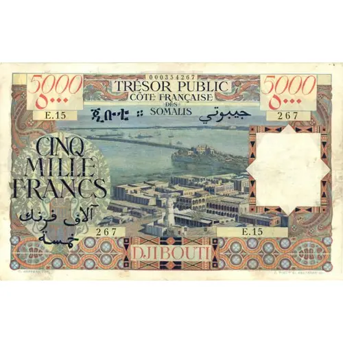 | Obverse lettering | 5000 ۵۰۰۰ TRÉSOR PUBLIC CÔTE FRANÇAISE DES SOMALIS ጅቡቲ جيبوتي CINQ MILLE FRANCS خمسة آلاف فرنك DJIBOUTI C. SERVEAU FEC. J. PIEL - G. BELTRAND SC. (Translation: 5000. Public treasury. French Somaliland. Djibouti. Five thousand francs.) |
