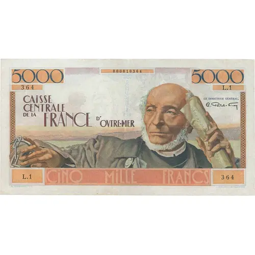 CINQ MILLE FRANCS L`ART. 139 DU CODE PENAL PUNIT DES TRAVAUX FORCÉS CEUX QUI AURONT CONTREFAIT OU FALSIFIÉ LES BILLETES DE BANQUE AUTORISÉS PAR LA LOI CAISSE CENTRALE DE LA FRANCE D`OUTRE-MER R. POUGHEON FEC. A. MARLIAT SC. (Translation: Five Thousand Francs Article 139 of the Penal Code punishes forced Labor those who have counterfeited or falsified banknotes authorized by Law. Central Fund of Overseas France) |