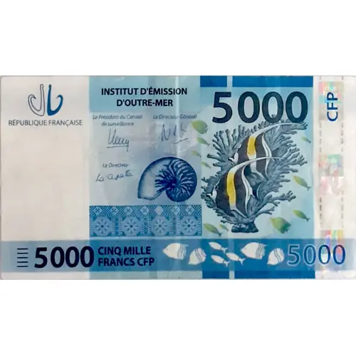 REPUBLIQUE FRANÇAISE INSTITUT D`ÉMISSION D`OUTRE-MER 5000 CINQ MILLE FRANCS CFP (Translation: French Republic Overseas Note-Issuing Bank Five Thousand Francs CFP.) |