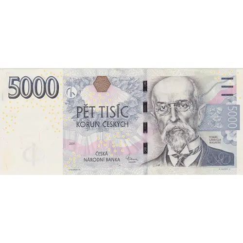 | Obverse lettering | 5000 PĚT TISÍC KORUN ČESKÝCH Tomáš Garrigue Masaryk ČESKÁ NÁRODNÍ BANKA O. KULHÁNEK INV. M. ONDRÁČEK SC. (Translation: 5000 FIVE THOUSAND CZECH KORUNA Tomáš Garrigue Masaryk CZECH NATIONAL BANK) |