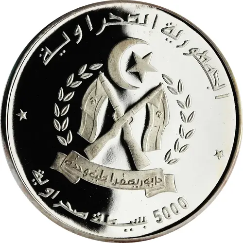 Historical Context: The 1997 5000 Pesetas coin from Western Sahara emerges from a complex geopolitical context. Issued by the Sahrawi Arab Democratic Republic (SADR), a government-in-exile asserting sovereignty, these coins primarily served as non-circulating legal tender (NCLT) for collectors. Honoring Miguel de Cervantes, Spain's literary icon, reflects a cultural acknowledgment, possibly referencing the region's historical Spanish ties. Such issues aimed to generate revenue and symbolically assert statehood amidst ongoing self-determination efforts.