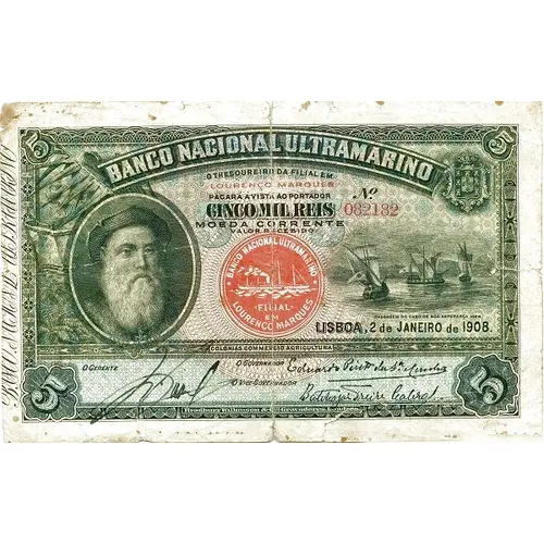 BANCO NACIONAL ULTRAMARINO O THESOUREIRO DA FILIALA EM LOURENÇO MARQUES PAGARÁ Á VISTA AO PORTADOR CINCO MIL REIS EM MOEDA CORRENTE VALOR RECEBIDO |