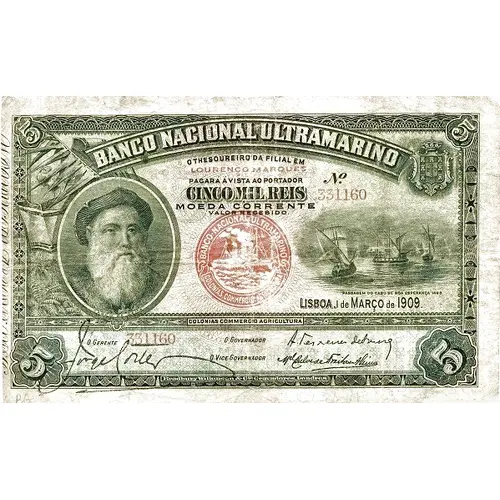 BANCO NACIONAL ULTRAMARINO O THESOUREIRO DA FILIALA EM LOURENÇO MARQUES PAGARÁ Á VISTA AO PORTADOR CINCO MIL REIS EM MOEDA CORRENTE VALOR RECEBIDO |