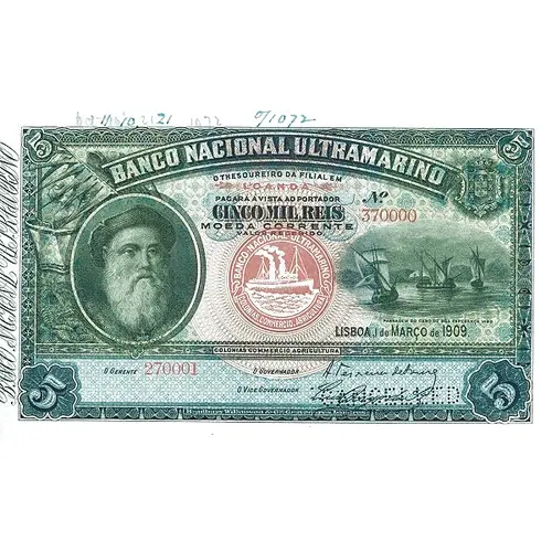 | Obverse lettering | BANCO NACIONAL ULTRAMARINO O THESOUREIRO DA FILIAL EM LOANDA PAGARÁ Á VISTA AO PORTADOR CINCO MIL REIS EM MOEDA CORRENTE VALOR RECEBIDO (Translation: National Overseas Bank, The Branch Treasurer in Luanda, Will pay the holder on sight five thousand réis in current currency) |