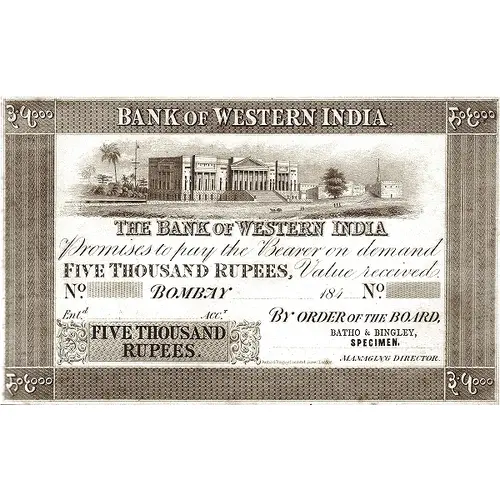 | Obverse lettering | BANK OF WESTERN INDIA Promises to pay the Bearer on demand 5000 Rupees. Value recived. By Order Of The Board. |
