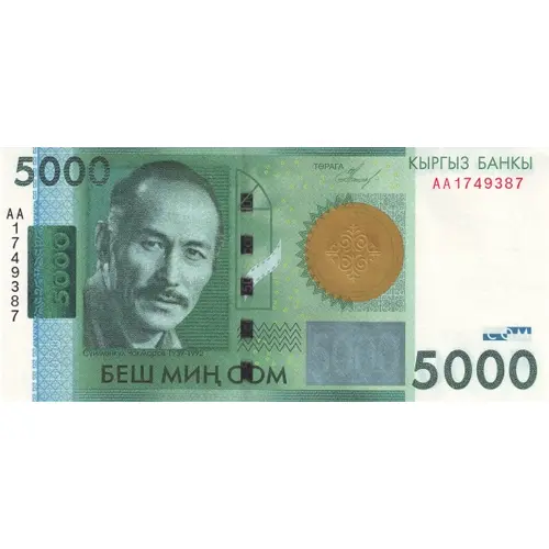 | Legenda del dritto | 5000 КЫРГЫЗ БАНКЫ БЕШ МИҢ СОМ 5000 (Translation: Bank of Kyrgyzstan, Five Thousand Som) |