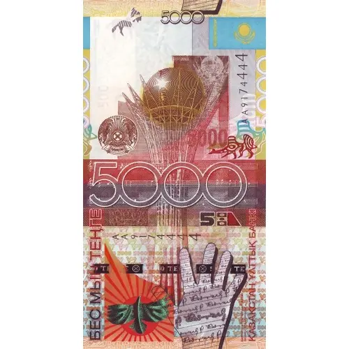 | Obverse lettering | 5000 БЕС МЫҢ ТЕҢГЕ БАНКНОТТАРДЫ ҚОЛДАН ЖАСАУ ЗАҢМЕН ҚУДАЛАНАДЫ ҚАЗАҚСТАН ҰЛТТЫҚ БАНКІ (Translation: Five Thousand Teñge, Counterfeiting banknotes is punished by law, National Bank of Kazakhstan) |
