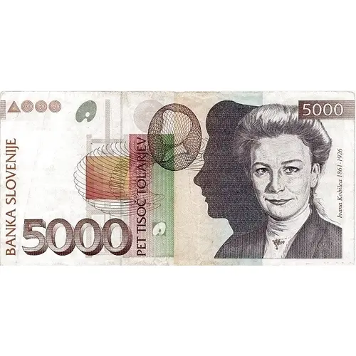 | 表面の銘文 | BANKA SLOVENIJE 5000 PET TISOČ TOLARJEV Ivana Kobilica (1861-1926) (Translation: Bank of Slovenia 5000 Tolars) |