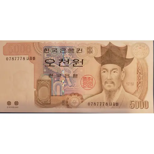 한국은행권 오천원 한국은행 © 한국은행 2002 (Translation: Korean banknote, Five Thousand Won, Bank of Korea) |