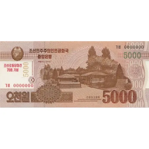 | Надписи лицевой стороны | 조선민주주의인민공화국 중앙은행 조선로동당창건 70돐 기념 오천원 5000 (Translation: The Central Bank of the Democratic People`s Republic of Korea, 70th Anniversary of the Foundation of the Workers` Party of Korea, Five Thousand Won) |