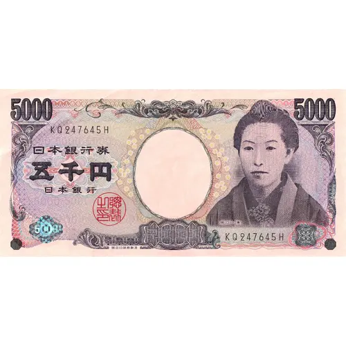 | Description de l’avers | Multicolour print (2 main colours (violet) and 10 background colours); red seal; black or brown serial numbers. Bust of HIGUCHI Natsu (pen name: HIGUCHI Ichiyō), front-facing on the right. Denominations in arabic numeral on top-left and top-right corner. Denomination in Kanji on left center. Seal of the Governor of the Bank of Japan to the lower left. Multiple `5000` in the background. Hologram at bottom-left corner, which change from `5000`, symbol of Bank of Japan surrounded by multiple Sakura cheery blossoms, and multiple small `NIPPON`, by angle of view; small `NIPPON GINKO` on top, and another one inverted on bottom; hidden 日 on center top and 本 on center bottom. EURion constellations left and right of the center window. Latent Image `5000` when look from bottom, below the center window. Tactile octagons each on bottom-left corner and bottom right corner. Repeating `NIPPONGINKO` in microtexts below the top-left and top-right denomination; multiple `NIPPONGINKO` in microtext in the background motifs around lower-right of the frame; repeting `NIPPONGINKO` in microtext along the top of the frame; repeting `NIPPONGINKO` in microtext on the bottom-right of the frame. Left edge and right edge printed with special ink, which slightly glow pink when looks from certain angle. Serial number consist of one or two latin alphabets, following by 6-digits number, then one latin alphabets. |