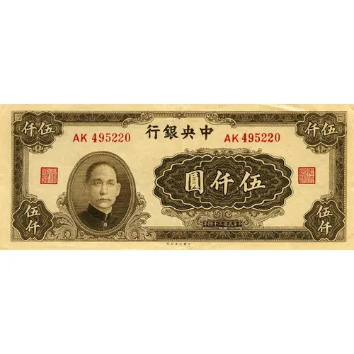 | Obverse lettering | 行銀央中 圓仟伍 年四十三國民華中 (Translation: Central Bank of China Five Thousand Yuan Printed in the 34th year of the Republic) |