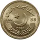 The waxing crescent moon and five-pointed star facing North West in rising position is in the center. The periphery on the top of the crescent star is inscribed in the wording `ISLAMI JAMHORIA PAKISTAN`, `اسلامہ جمہوریہ پاکستان` in Urdu script. Below the crescent and at the top of two springs of wheat with arms curved upward, there is the year of issuance 2024. The face value of the coin in numeral “55” in bold letters and `RUPIA`, `روپیہ` in Urdu script are written on the right and left sides of the crescent star respectively. |
