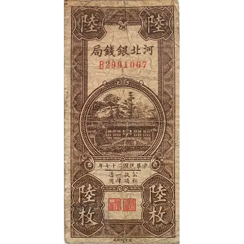 | Obverse lettering | 河北銀錢局 中華民國二十七年 公私款項一律通用 陸枚 北京印刷局 (Translation: Ho Pei Metropolitan Bank 27th year of the Republic of China In common use for government and private payment 6 Coppers (0.6 Cents) Beijing Printing Bureau) |