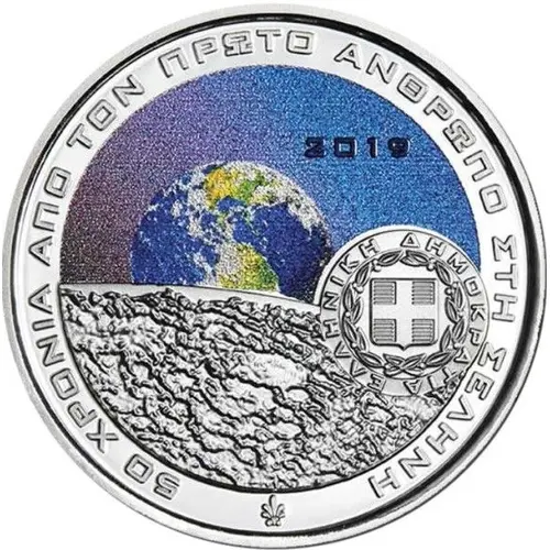 | Obverse description | The design contains a colored depiction of earth as seen from the surface of the moon. The Greek Coat of Arms is placed on the right and the issue year `2019` is shown above it. The text `50 YEARS FROM THE FIRST MAN ON THE MOON` in Greek, along with the palmette, the symbol of the Hellenic Mint, encircles the design. |