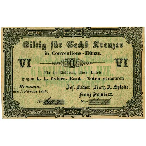 Obverse lettering Gültig für Sechs Kreuzer in Conventions-Münze VI 6 Für die Einlösung dieser Billets gegen k. k. österr. Bank-Noten garantieren Braunau den 1. Februar 1849. Joſ. Fiſcher. Franz A. Spiske. Franz Schubert. 6. KREUZER CONV. MZE.