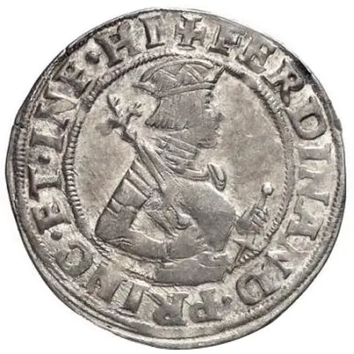 Portrait half size facing right, holding a scepter at right hand and the sword at left, within a cirlce. Legend around for `Ferdinandus Princeps et Infans Hispaniae` |