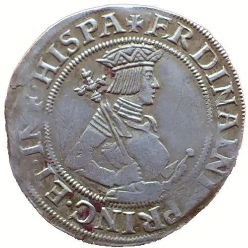 Crowned and armoured portrait to the right of Ferdinand I of Habsburg holding scepter, in a circle of pearls. Legend around for `Ferd. Princeps et Infans Hispaniae`. |