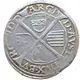 A cross divides in 4 quadrants, a shield in each quadrant, Austria on top, the 4 verticle bars of Aragon to the right, the shield of Burgundy below and the tower of Castilla to the left, all within a beaded circle. Legend, divided by the cross for `Archidux Austriae Dux Burgundiae` |