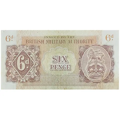 | Obverse lettering | ISSUED BY THE BRITISH MILITARY AUTHORITY SIX PENCE 6d. |