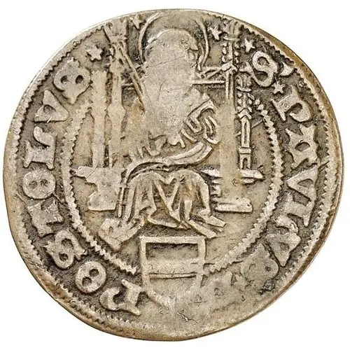 | Descripción del anverso | Facing figure of St. Paul seated on throne, small shield of Münster arms below, legend in Gothic letters |